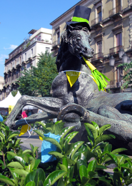 This sculpture is called il stallone ferita (the wounded stallion) and is usually far more sombre. For Umbertata he had his party gear on.