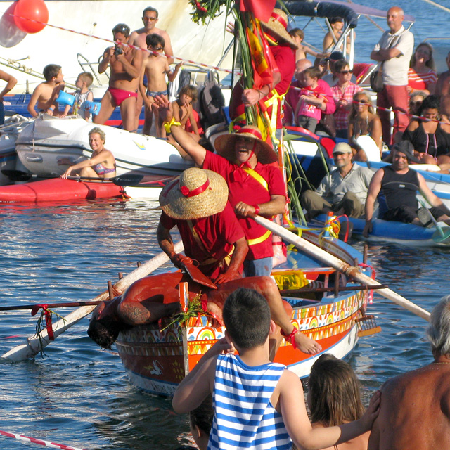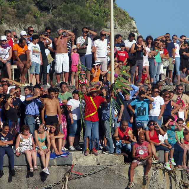 The edge of the harbour is lined with boats, all of which are teeming with people – mainly young men – who are brown as berries from the sea and the sun, and (un)dressed for a swim. Somewhere in among this motley crew is ‘il pesce’ – the fish – but at this point in time it’s not clear where: the boat people’s job is to hide him until he chooses to sneak out into open water. It’s not long before he does so: there’s a shout from ‘i rais’ and a cheer from the crowd. The fishermen in the boat throw their arms up into the air with whoops of glee – the chase is on!