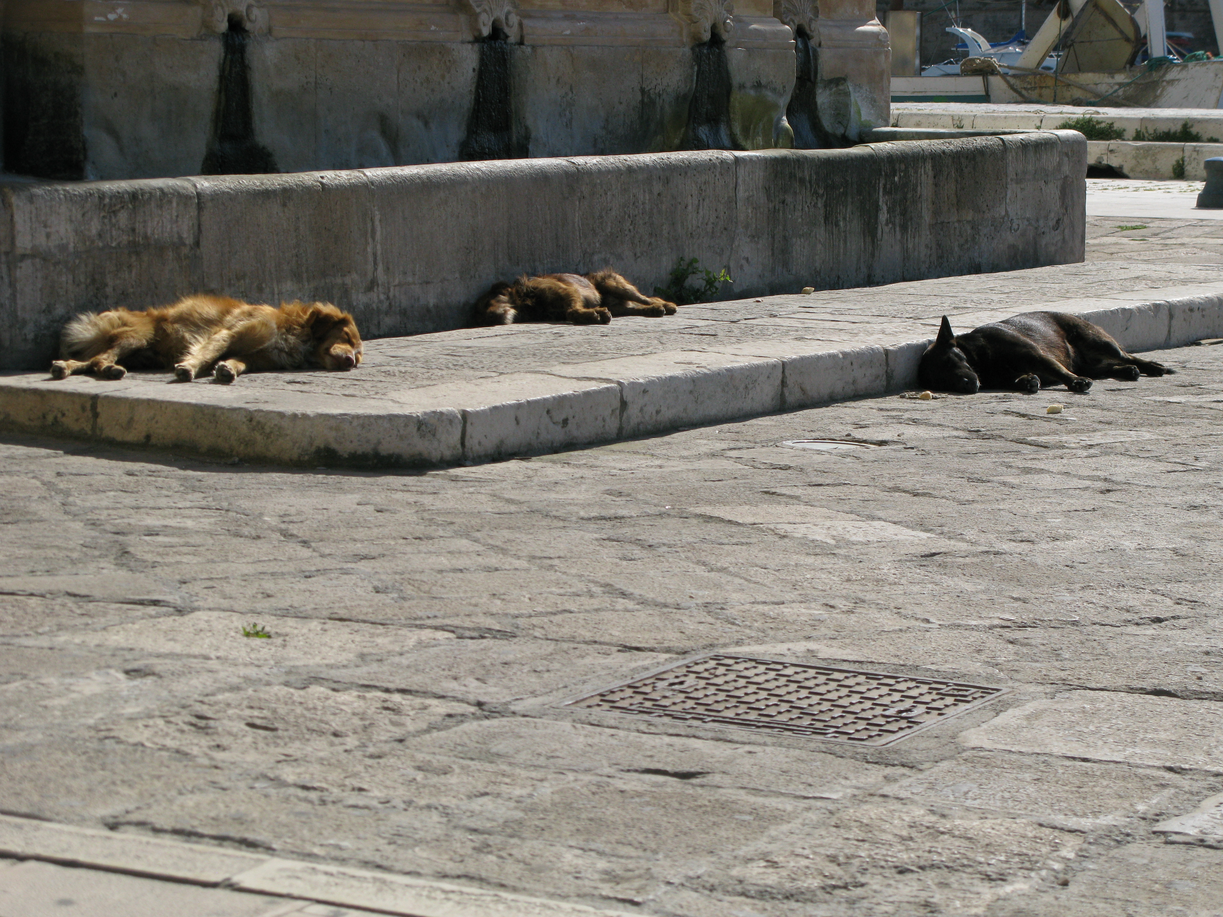 Heading back onto the main promenade, I spy a large, weathered, sculpted fountain at the town side entrance to the harbour. Three dogs flop on its leeward side, sheltered from the wind. They’re a motley crew – one golden retriever, one bristly little rough-coated terrier with a happy grin on his muzzle, and an overweight labrador cross. They probably don’t belong to anyone sitting here now, but have chosen the spot for its prime sunbathing opportunities. As I move closer to take a photo, the terrier stretches to the very ends of his toes and sighs luxuriously, while the retriever twitches his nose at me, checking whether I’m bringing food. (No.) I leave them to their lazing, and head inside the handy next door cafe to start the important process of choosing gelato.