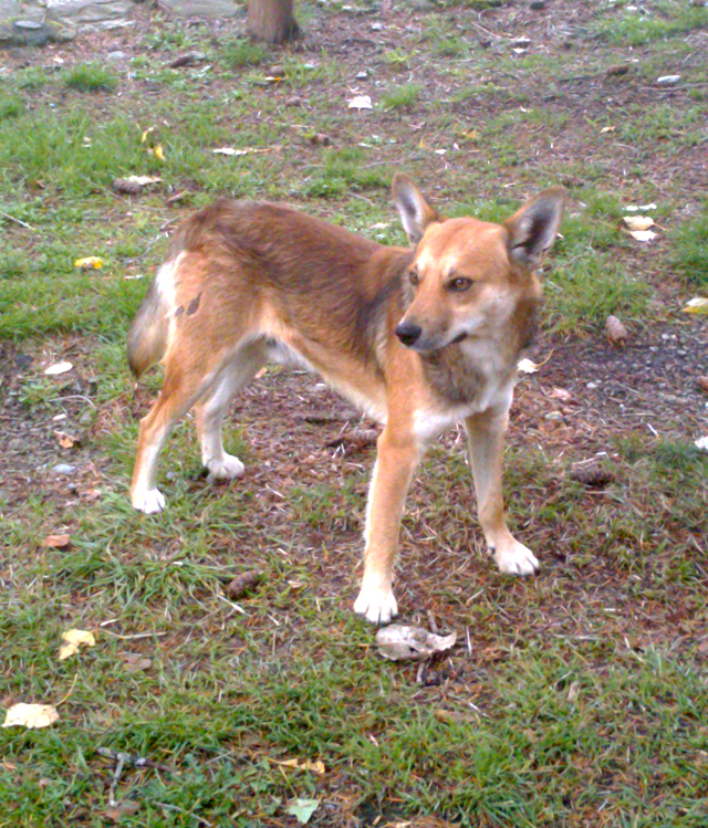 Another dog – a large, brindle-coloured thing that looks like she has Dobermann in her somewhere – appears out of a previously unnoticed kennel to the left of us, on the far side of the mesh fence. She’s wearing a heavy choke-chain and doesn’t look like the kind of animal you mess with. I move out of range. The dog-slash-fox, however, is unfazed. She leaps up onto the wall and greets the Dobey like an old friend. The Dobey, in turn, dances about on her side of the fence, squirming her tummy and wiggling her little stump of a tail as she snuffles through the wire mesh, rubbing noses with the dog-slash-fox. So much for the tough-girl exterior.