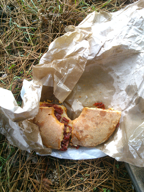 According to signs in the park, it’s a 1.4km walk from the bridge to the picnic area by the park gate. It’s then a 4km walk (uphill) from the picnic area to the lake. The lake itself is a coffee-coloured, muddy body of water held in place at one end by a dam made of large concrete blocks, and it’s nothing special. The hike to get there, on the other hand, is exhilarating, and works up an appetite for lunch. When we get there, it’s just started to drizzle, so we head for the pine forest on the far side of the reservoir and sit down on a convenient wooden pallet to eat the Cesarò sandwich.